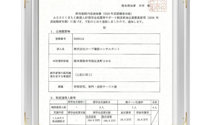 この度、「ふるさとくまもと創造人材奨学金返還等サポート制度」の参加企業となりました。 2026年度就職予定の大学院修了者等・4年制大学卒業者等を対象...
